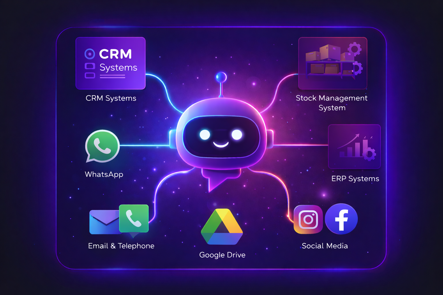 We create tailored integrations for our bots including integrating with your chosen CRM system if you don’t want to use ours, your stock management system, social media channels, customer contact channels and any bespoke integration that your business needs.